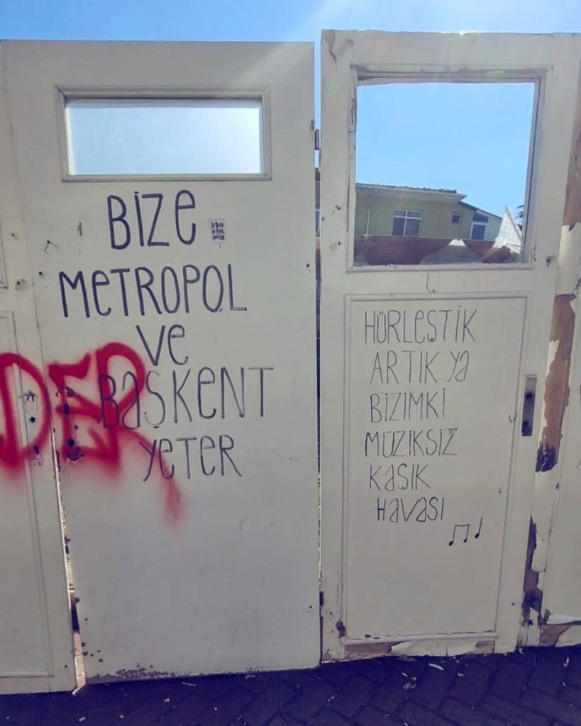 Bu açıdan bakınca Ankara’nın merkezinde, yerleşik ve sivil mimari örneklerini taşıyan mahallelerinin 2010’lardan, daha doğrusu 2012 yılında yürürlüğe giren 6306 sayılı Kentsel Dönüşüm Yasası çıkarıldığından bu yana yaşadığı ağır dönüşüme yakılmış bir ağıt gibi bu müdahaleler. Ankara’nın güzel yıllarına denk gelmiş kuşaklar son 10 yıldır, kendiliğinden bir çabayla bu yıkımın belleğini tutuyor, gayriresmi tarihini yazıyor. Buradan baktığımda, Erciyas’ın yazılamalarını birbiriyle ilişkisi olmayan, birbirinden bağımsız ama duygusunda ortak bu çabanın bir veçhesi olarak görüyorum.