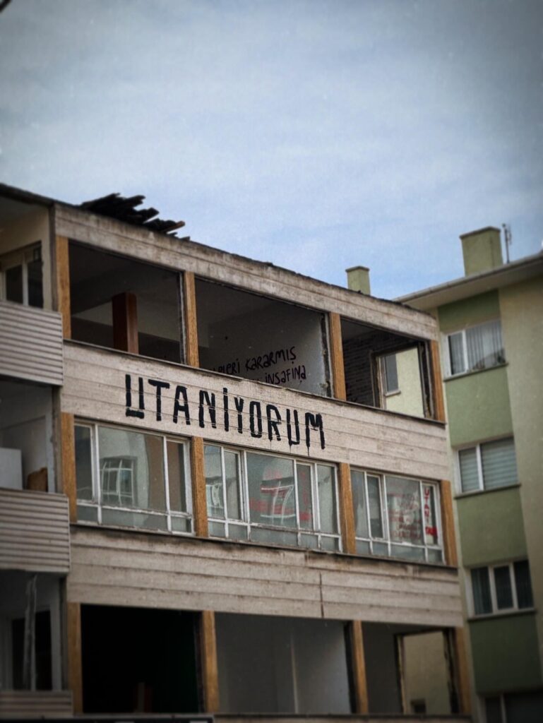 Sonrasında, geçen ayın ortasında tesadüfi bir karşılaşmada bu sorulara aradığım yanıtı buldum. Esat Caddesi 50 numarada bulunan Baysal Apartmanı önünden geçerken yıkım için ön hazırlıkların başlamış olduğunu gördüm. Binanın çevresi kapılarla değil (belli ki belediyenin bir müdahalesi olmuştu) fakat demir panellerle çevrilmiş ve pencere çerçeveleri sökülmüştü. Ön cepheye bakan en üst kat duvarında ise büyükçe bir “Utanıyorum” yazısı görülüyordu. Erciyas’ın işi olduğu belliydi ve son dönemde adeti olduğu üzere belirli (ama illaki Ankara’ya ya da Ankara’daki bize değen) şarkıların sözlerine dayanıyordu bu binadaki yazılmalar da.