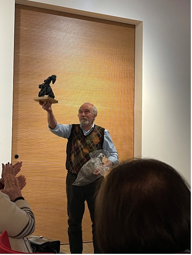 Heykeltıraş Metin Yurdanur, fotoğrafçı Ozan Sağdıç’a hediyesi olan anıt heykelle ilgili konuşurken (13 Şubat 2025 / Erimtan Müzesi -Ankara)