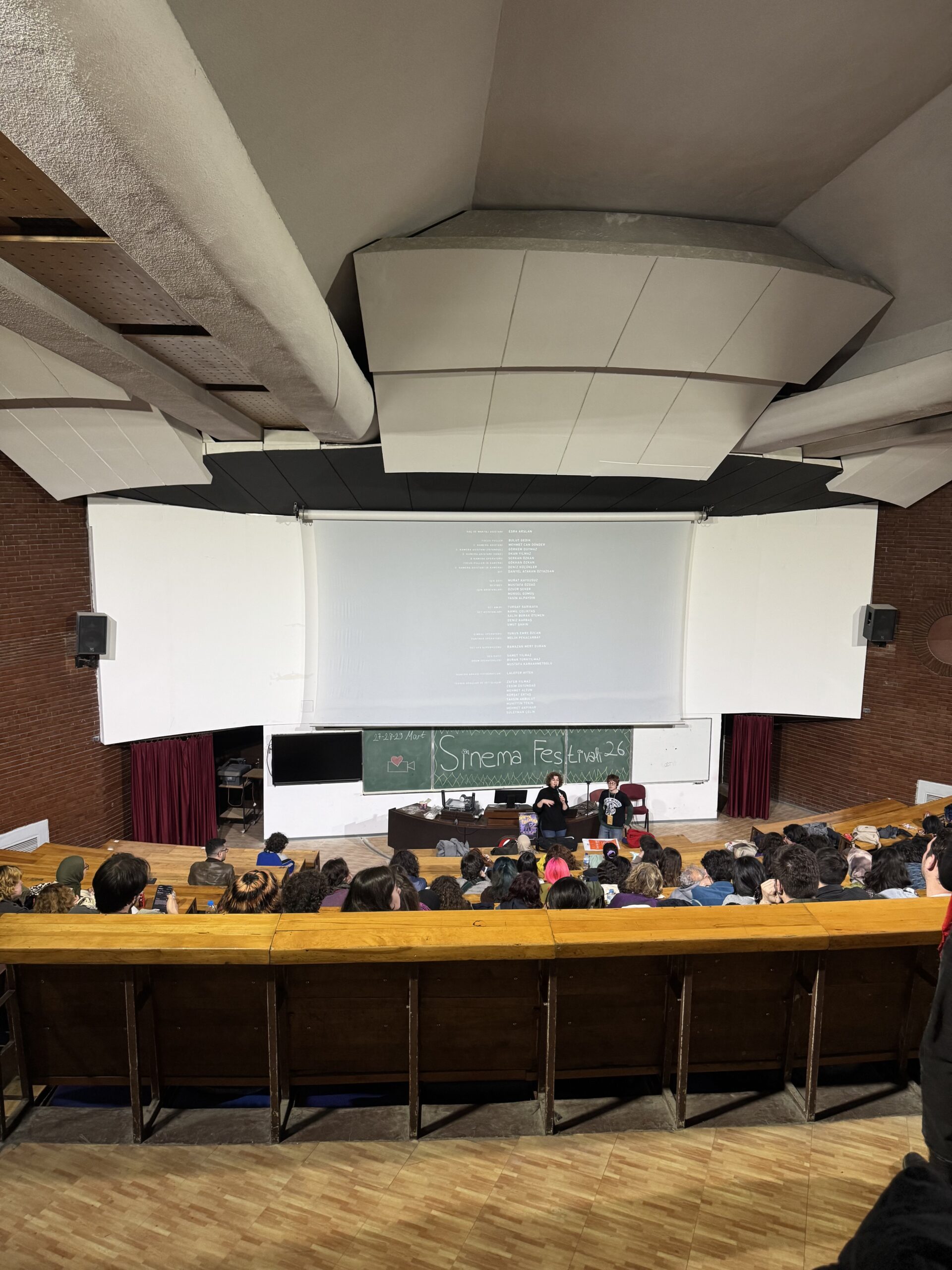 Günün kapanışını ise başka bir köşede, SİTOP (ODTÜ Sinema topluluğu) tarafından bu yıl 27 – 29 Mart tarihleri arasında düzenlenen ODTÜ Sinema Festivali’nin kapanış etkinliğin olan, yönetmen Pelin Esmer’in katılımıyla U3 – Necdet Bulut Amfisi’nde gerçekleştirilen O da Bir Şey mi (2025) film gösteriminde yaptım. U3’ten bakarken, yeniden başlayan ODTÜ Sanat’a dair bir kısım tartışmanın sürdüğünün de farkında olduğumu not edeyim yazının sonuna gelmişken. Benim izlediğim ikinci günde öğrenci katılımının beklenenden düşük olması düzenleyenler açısından bir gündemdi. Etkinliklerin ara sınavlar haftasına denk gelmesi, yeterince duyurulmadığına ilişkin kaygıların ardından “ama” olarak ifade ediliyordu. Bu gibi değerlendirmeler için sanıyorum henüz erken. ODTÜ Sanat tekrar rayına girdiğinde, gelecek senelerden bugünlere bakacak olanlara sözü bırakmalı.